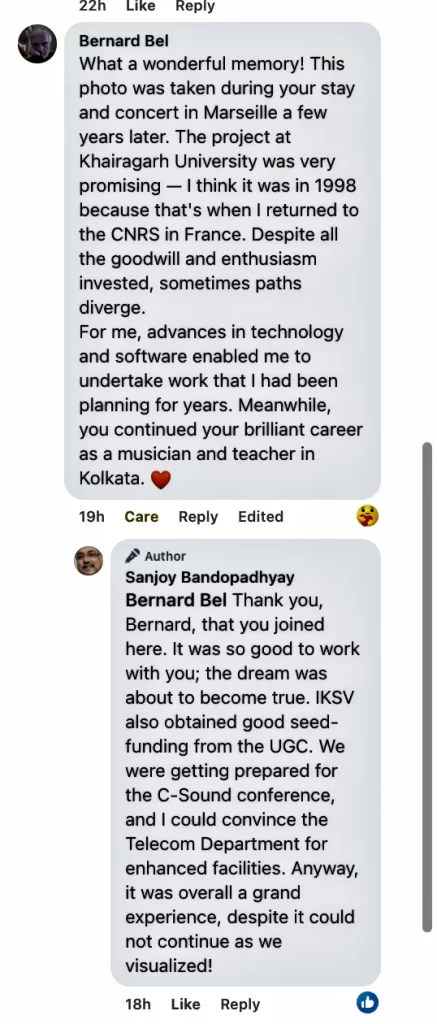 I feel immense joy remembering my inspiring and action-packed collaboration with Dr. Bernard Bel, a visionary computer scientist of global repute. He was the catalyst who helped me push the boundaries of tradition by dreaming up the inclusion of Computer Music in Indian university education — at a time when “digital” was still a whisper in the academic corridors of music!